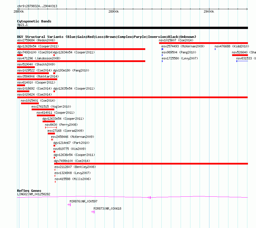 | Variant Type | CNV loss | Copy Number | | Allele State | | Allele Origin | | Probe Count | | Validation Flag | | Merged Status | M | Merged Variants | | Supporting Variants | nssv3688765 | Samples | | Known Genes | LINGO2, MIR873, MIR876 | Method | SNP array | Analysis | Affymetrix SNP array copy number analysis | Platform | Affymetrix SNP Array 6.0 | Comments | | Reference | Coe_et_al_2014 | Pubmed ID | 25217958 | Accession Number(s) | nsv1020624