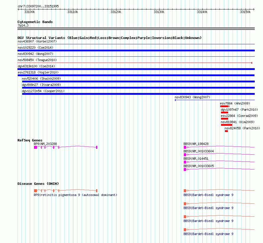 | | Variant Type | CNV gain | | Copy Number | | | Allele State | | | Allele Origin | | | Probe Count | | | Validation Flag | | | Merged Status | M | | Merged Variants | dgv6319n100 | | Supporting Variants | nssv3643397, nssv3752943, nssv3643391, nssv3643395, nssv3643394, nssv3643392, nssv3752941, nssv3752945, nssv3643393, nssv3752946, nssv3643396, nssv3752942, nssv3752944, nssv3643398, nssv3643390, nssv3643389 | | Samples | | | Known Genes | BBS9, RP9 | | Method | SNP array | | Analysis | Affymetrix SNP array copy number analysis | | Platform | Affymetrix SNP Array 6.0 | | Comments | | | Reference | Coe_et_al_2014 | | Pubmed ID | 25217958 | | Accession Number(s) | nsv1020741
