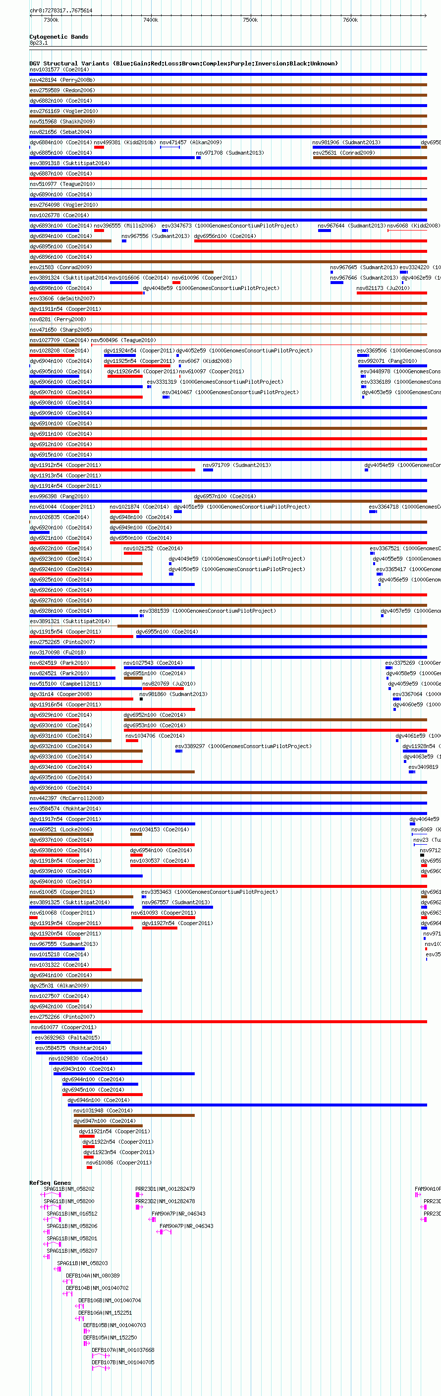 | | Variant Type | CNV gain | | Copy Number | | | Allele State | | | Allele Origin | | | Probe Count | | | Validation Flag | | | Merged Status | M | | Merged Variants | dgv6908n100 | | Supporting Variants | nssv3680189 | | Samples | | | Known Genes | DEFB104A, DEFB104B, DEFB105A, DEFB105B, DEFB106A, DEFB106B, DEFB107A, DEFB107B, FAM90A10P, FAM90A7P, PRR23D1, PRR23D2, SPAG11B | | Method | SNP array | | Analysis | Affymetrix SNP array copy number analysis | | Platform | Affymetrix SNP Array 6.0 | | Comments | | | Reference | Coe_et_al_2014 | | Pubmed ID | 25217958 | | Accession Number(s) | nsv1021122