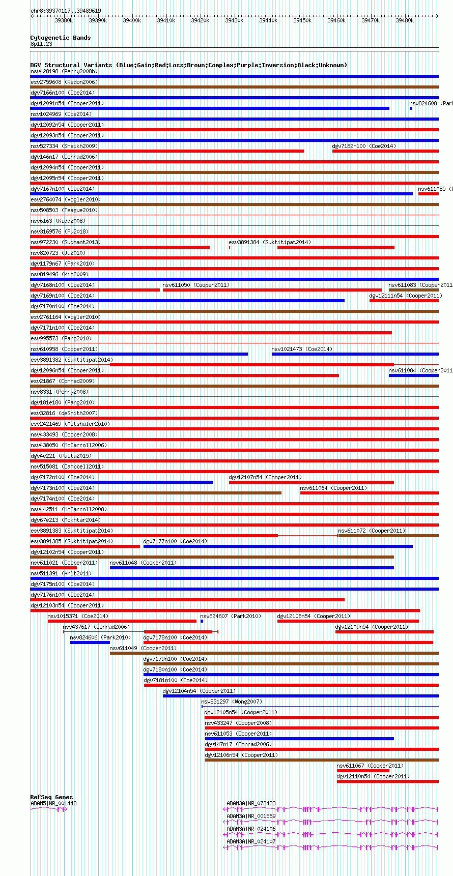 Variant DetailsVariant: nsv1021615| Internal ID | 19110833 | | Landmark | | | Location Information | | | Cytoband | 8p11.22 | | Allele length | | Assembly | Allele length | | hg38 | 119503 | | hg19 | 119503 | | hg18 | 119503 |