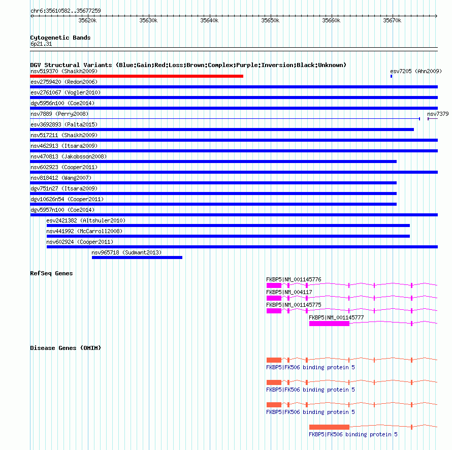 | | Variant Type | CNV gain | | Copy Number | | | Allele State | | | Allele Origin | | | Probe Count | | | Validation Flag | | | Merged Status | M | | Merged Variants | dgv5957n100 | | Supporting Variants | nssv3657394, nssv3657393 | | Samples | | | Known Genes | FKBP5 | | Method | SNP array | | Analysis | Affymetrix SNP array copy number analysis | | Platform | Affymetrix SNP Array 6.0 | | Comments | | | Reference | Coe_et_al_2014 | | Pubmed ID | 25217958 | | Accession Number(s) | nsv1021675