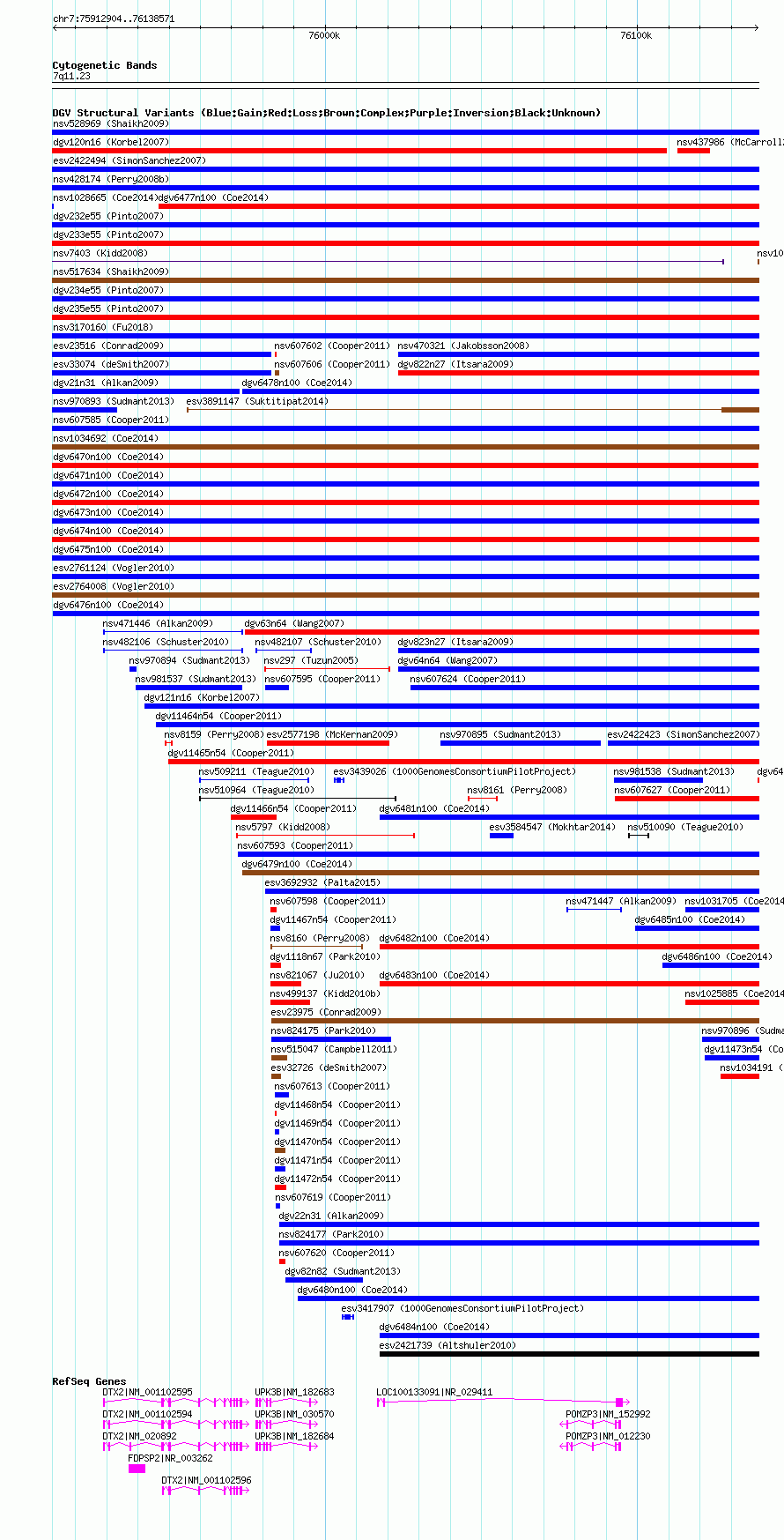 Variant DetailsVariant: nsv1021715| Internal ID | 19110933 | | Landmark | | | Location Information | | | Cytoband | 7q11.23 | | Allele length | | Assembly | Allele length | | hg38 | 225668 | | hg19 | 225668 | | hg18 | 225668 |