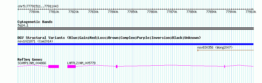 Variant DetailsVariant: nsv1021871| Internal ID | 19111089 | | Landmark | | | Location Information | | | Cytoband | 5q14.1 | | Allele length | | Assembly | Allele length | | hg38 | 119533 | | hg19 | 119533 | | hg18 | 119533 |