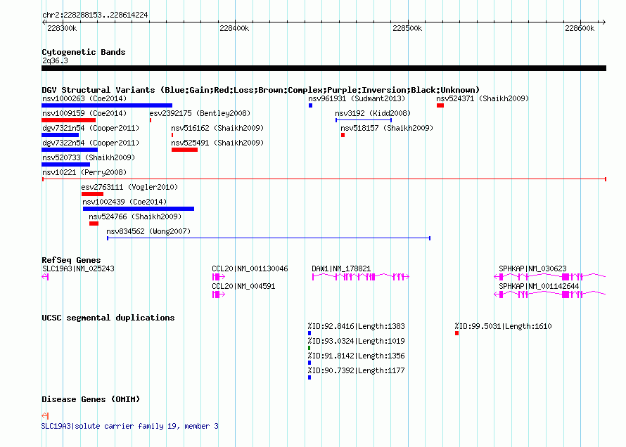 | Variant Type | CNV loss | Copy Number | | Allele State | | Allele Origin | | Probe Count | | Validation Flag | | Merged Status | M | Merged Variants | | Supporting Variants | nssv11721, nssv12330, nssv11579, nssv28911, nssv28249, nssv11803, nssv11858 | Samples | NA18504, NA12155, NA18860, NA18975, NA18572, NA19221, NA19173 | Known Genes | CCL20, DAW1, SLC19A3, SPHKAP | Method | Oligo aCGH | Analysis | Statistical threshold = 5.0, minimum +/- log2 ratio = 0.25 and minimum number of probes = 2 | Platform | Agilent-015686 Custom Human 244K CGH Microarray | Comments | | Reference | Perry_et_al_2008 | Pubmed ID | 18304495 | Accession Number(s) | nsv10221