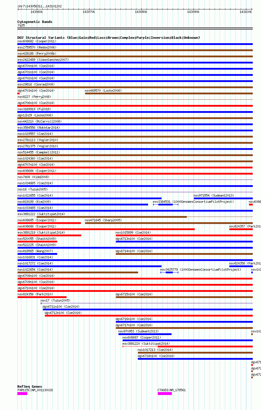 Variant DetailsVariant: nsv1022594| Internal ID | 19111812 | | Landmark | | | Location Information | | | Cytoband | 7q35 | | Allele length | | Assembly | Allele length | | hg38 | 44892 | | hg19 | 44892 | | hg18 | 44892 |