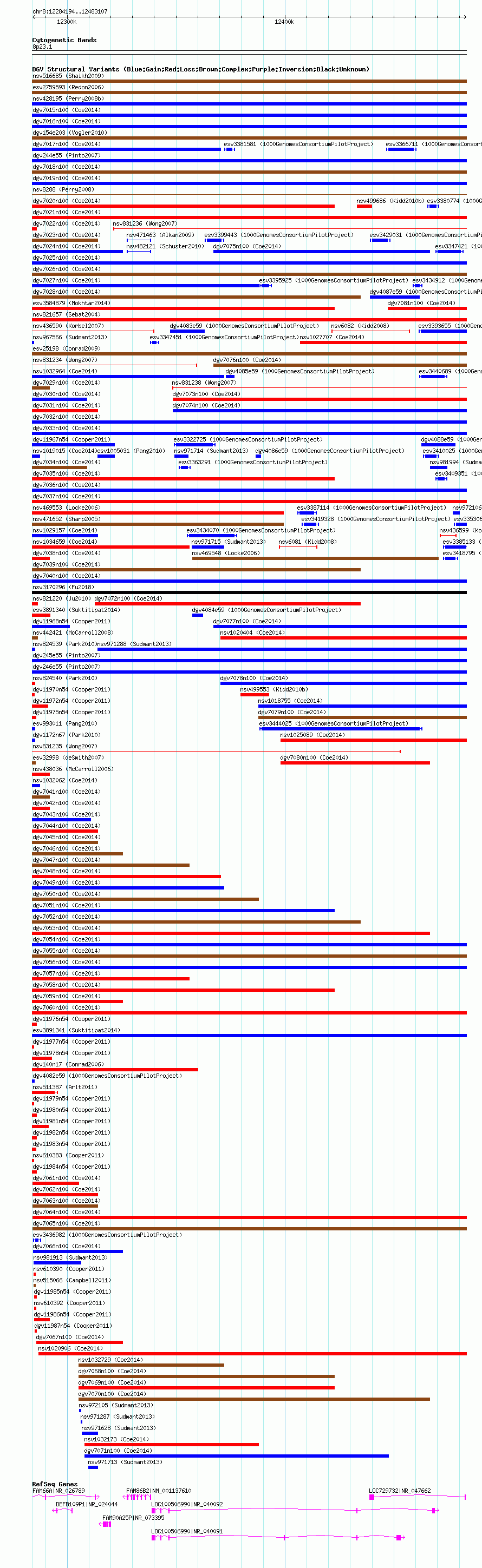 Variant DetailsVariant: nsv1022706| Internal ID | 19111924 | | Landmark | | | Location Information | | | Cytoband | 8p23.1 | | Allele length | | Assembly | Allele length | | hg38 | 198914 | | hg19 | 198914 | | hg18 | 198914 |