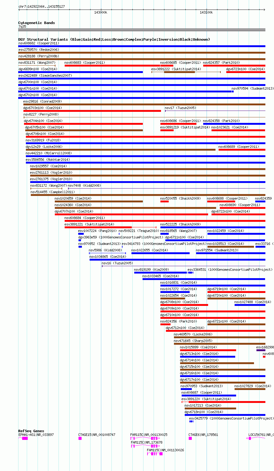 | | Variant Type | CNV gain | | Copy Number | | | Allele State | | | Allele Origin | | | Probe Count | | | Validation Flag | | | Merged Status | M | | Merged Variants | dgv6702n100 | | Supporting Variants | nssv3669694, nssv3669693 | | Samples | | | Known Genes | CTAGE15, CTAGE6, EPHA1-AS1, FAM115C, LOC154761 | | Method | SNP array | | Analysis | Affymetrix SNP array copy number analysis | | Platform | Affymetrix SNP Array 6.0 | | Comments | | | Reference | Coe_et_al_2014 | | Pubmed ID | 25217958 | | Accession Number(s) | nsv1022857
