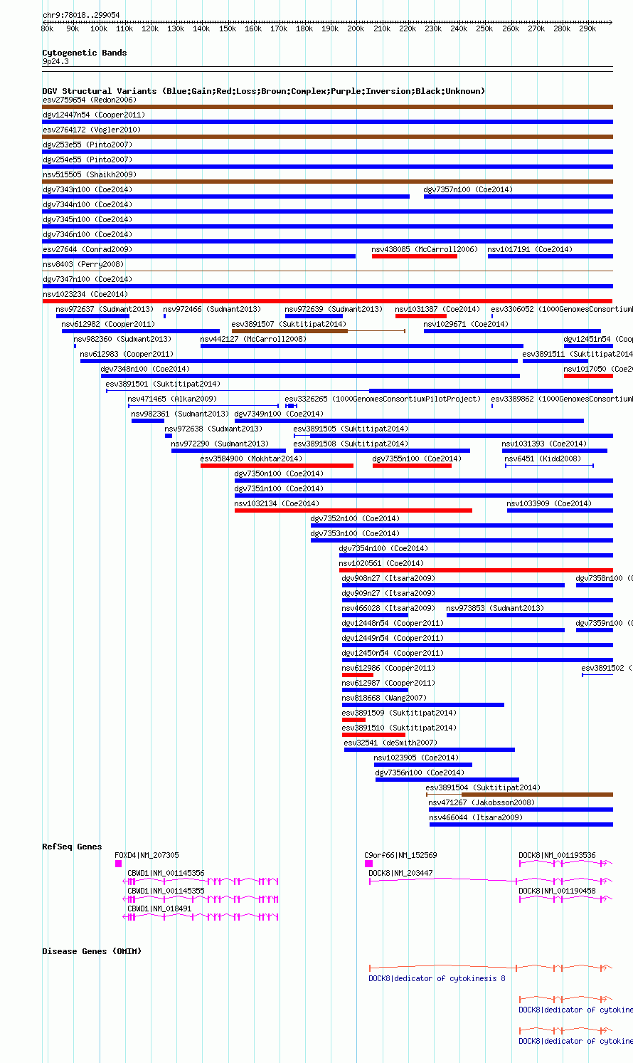 | Known Genes | C9orf66, CBWD1, DOCK8, FOXD4 |