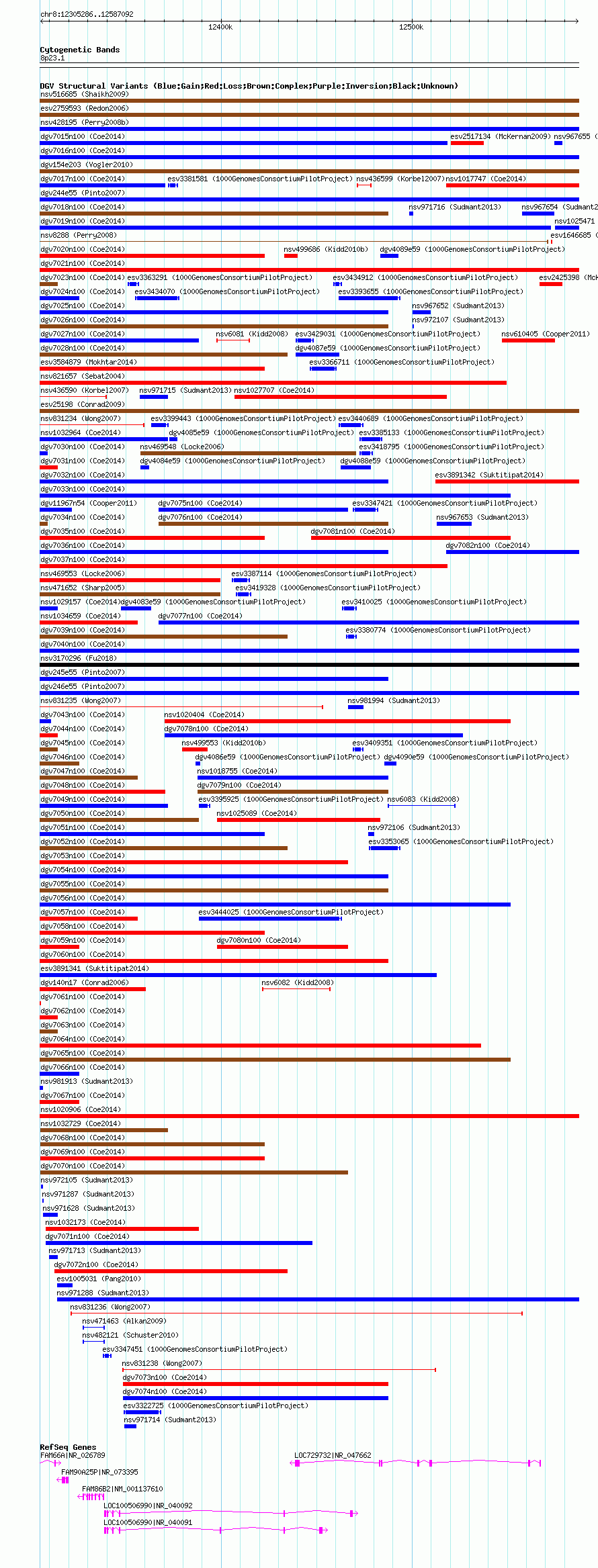 Variant DetailsVariant: nsv1023255| Internal ID | 19112472 | | Landmark | | | Location Information | | | Cytoband | 8p23.1 | | Allele length | | Assembly | Allele length | | hg38 | 281807 | | hg19 | 281807 | | hg18 | 281807 |