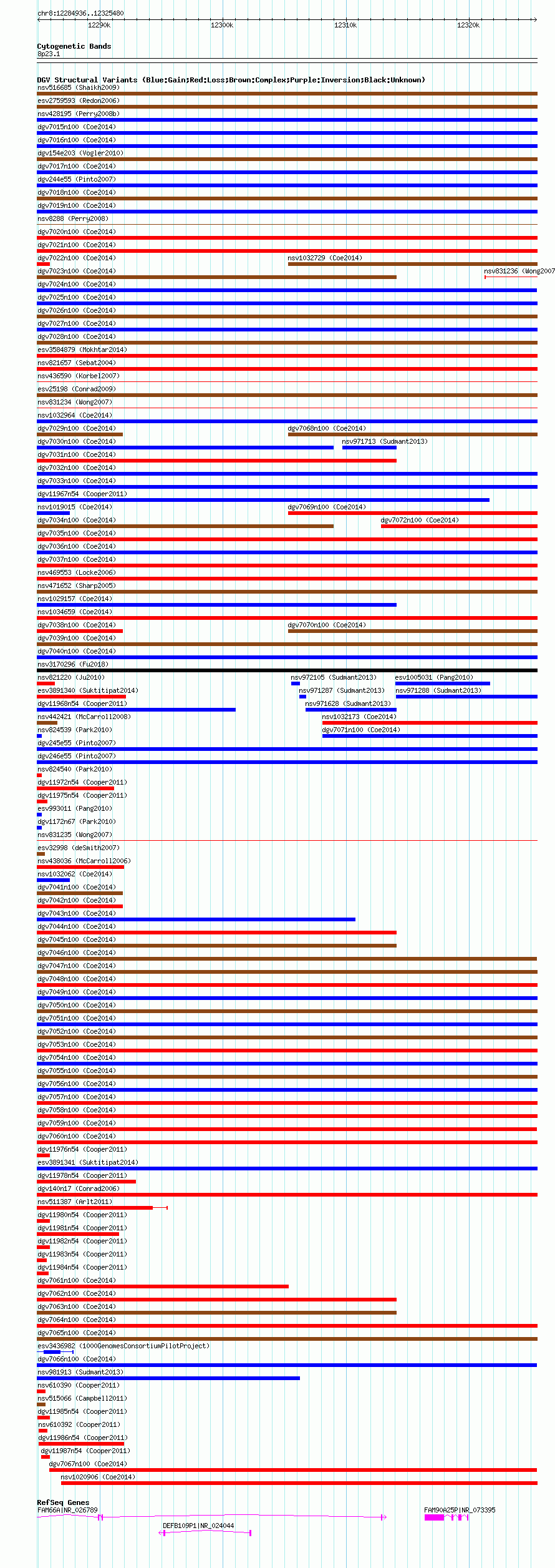 Variant DetailsVariant: nsv1023256| Internal ID | 19112473 | | Landmark | | | Location Information | | | Cytoband | 8p23.1 | | Allele length | | Assembly | Allele length | | hg38 | 40545 | | hg19 | 40545 | | hg18 | 40545 |
