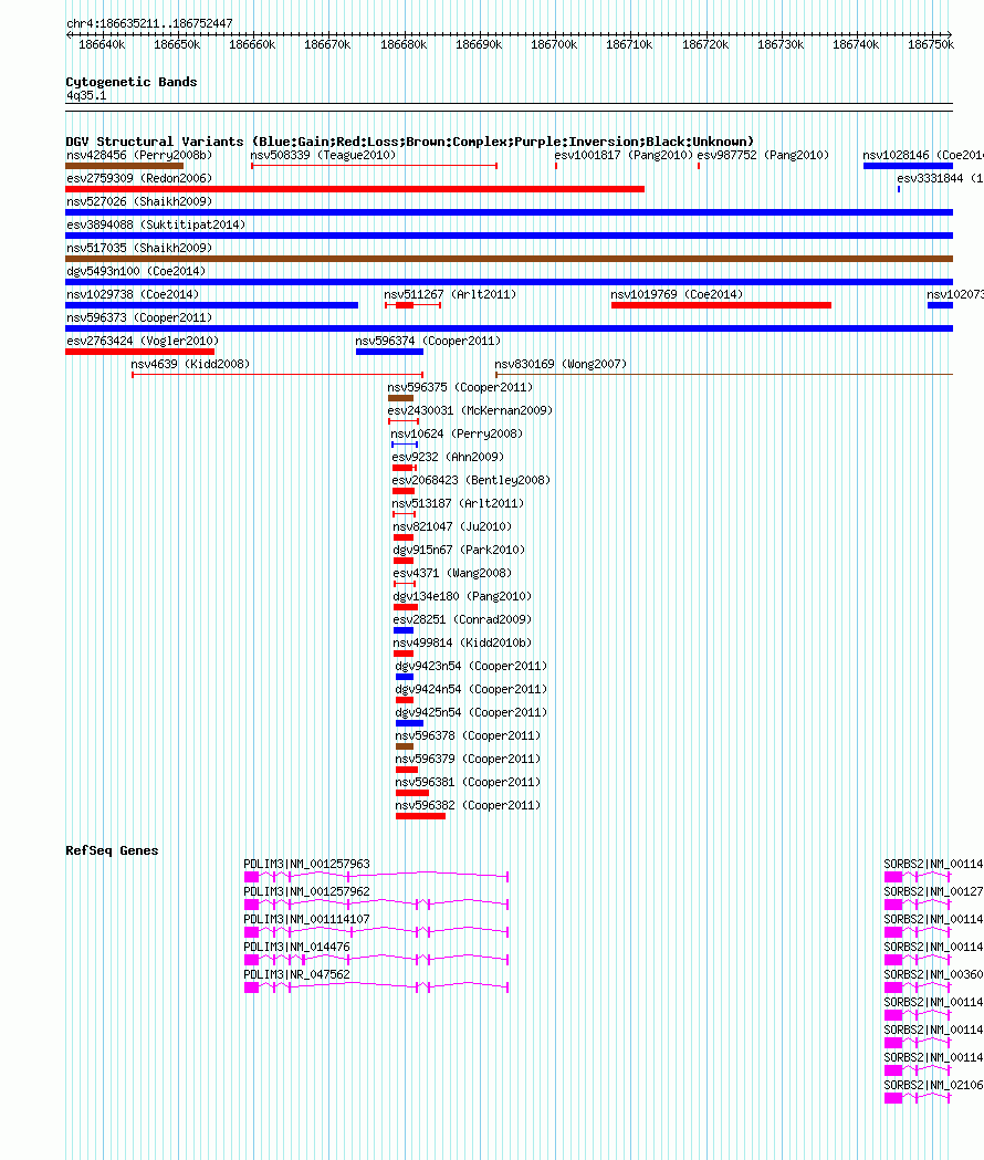 | Variant Type | CNV gain | Copy Number | | Allele State | | Allele Origin | | Probe Count | | Validation Flag | | Merged Status | M | Merged Variants | dgv5493n100 | Supporting Variants | nssv3635622, nssv3635623 | Samples | | Known Genes | PDLIM3, SORBS2 | Method | SNP array | Analysis | Affymetrix SNP array copy number analysis | Platform | Affymetrix SNP Array 6.0 | Comments | | Reference | Coe_et_al_2014 | Pubmed ID | 25217958 | Accession Number(s) | nsv1023365