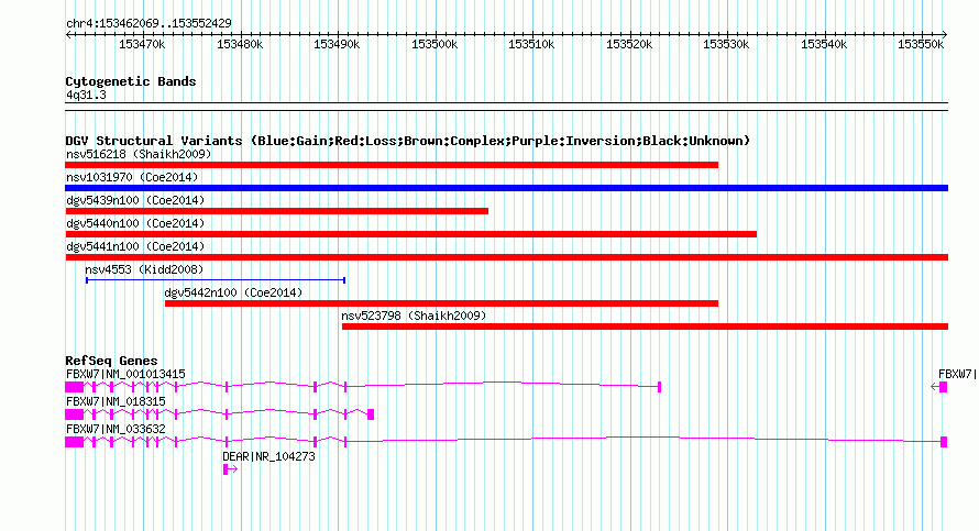 | | Variant Type | CNV loss | | Copy Number | | | Allele State | | | Allele Origin | | | Probe Count | | | Validation Flag | | | Merged Status | M | | Merged Variants | dgv5441n100 | | Supporting Variants | nssv3636108, nssv3636107 | | Samples | | | Known Genes | DEAR, FBXW7 | | Method | SNP array | | Analysis | Affymetrix SNP array copy number analysis | | Platform | Affymetrix SNP Array 6.0 | | Comments | | | Reference | Coe_et_al_2014 | | Pubmed ID | 25217958 | | Accession Number(s) | nsv1023383