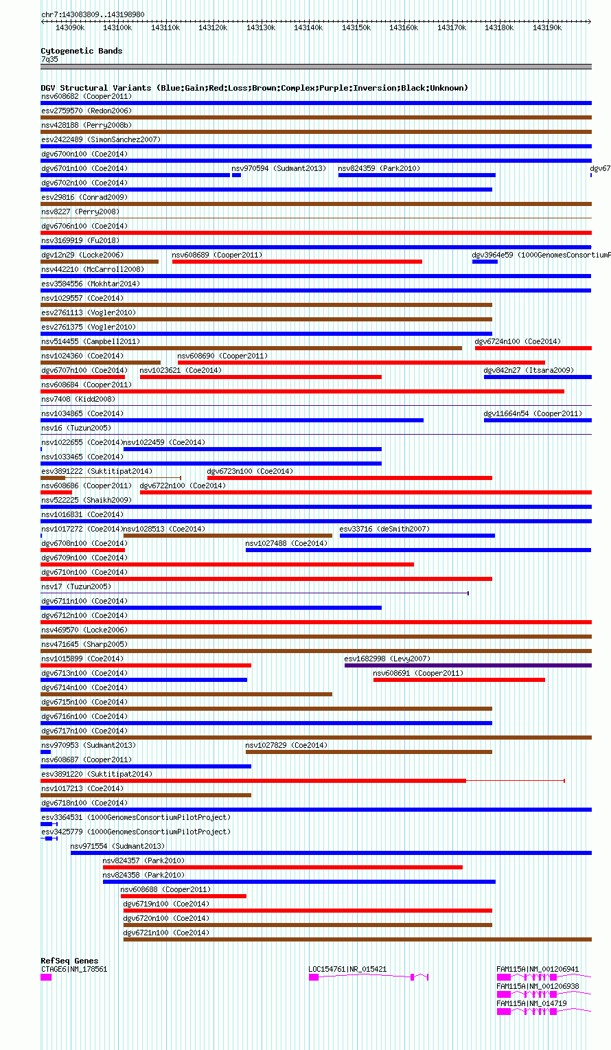 Variant DetailsVariant: nsv1023420| Internal ID | 19112637 | | Landmark | | | Location Information | | | Cytoband | 7q35 | | Allele length | | Assembly | Allele length | | hg38 | 115172 | | hg19 | 115172 | | hg18 | 115172 |