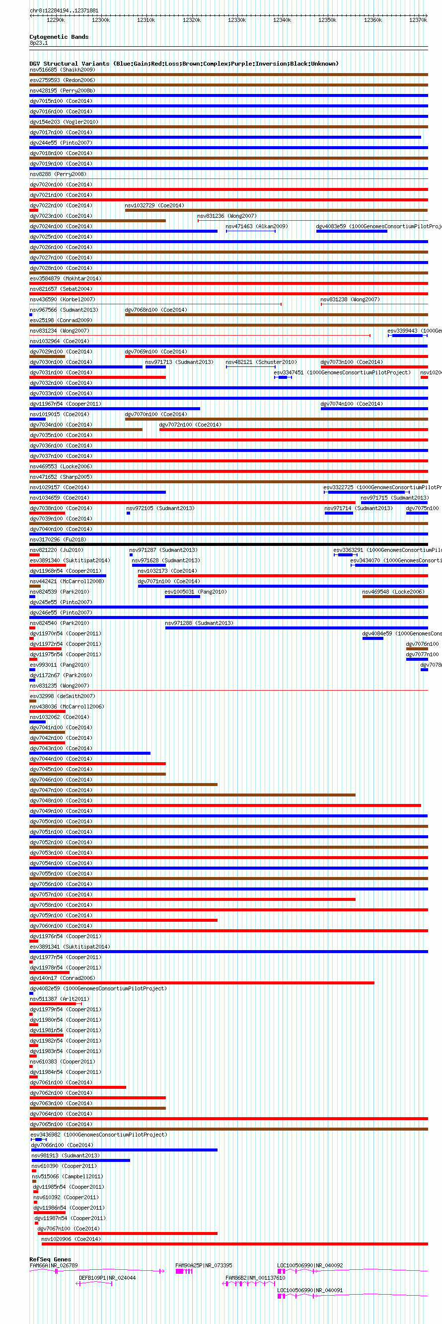 Variant DetailsVariant: nsv1023494 | Internal ID | 19112711 | | Landmark | | | Location Information | | | Cytoband | 8p23.1 | | Allele length | | Assembly | Allele length | | hg38 | 87688 | | hg19 | 87688 | | hg18 | 87688 |