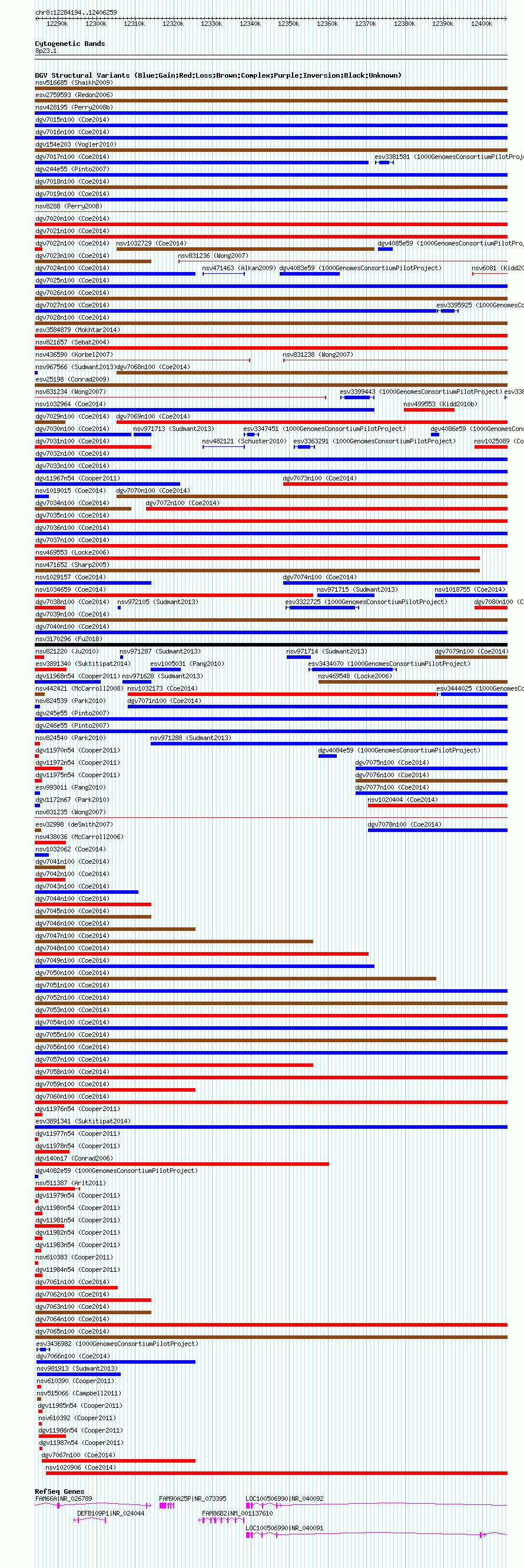 Variant DetailsVariant: nsv1024181| Internal ID | 19113398 | | Landmark | | | Location Information | | | Cytoband | 8p23.1 | | Allele length | | Assembly | Allele length | | hg38 | 122066 | | hg19 | 122066 | | hg18 | 122066 |