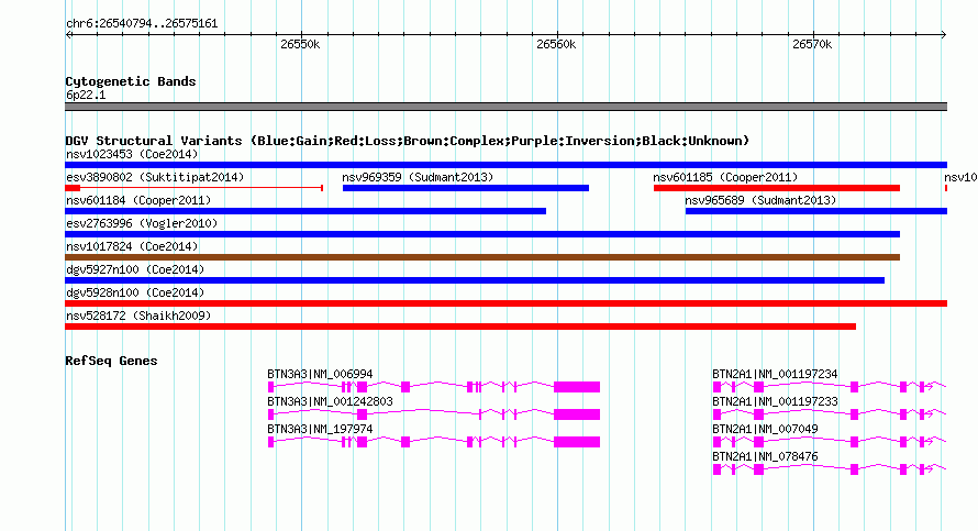 | | Variant Type | CNV loss | | Copy Number | | | Allele State | | | Allele Origin | | | Probe Count | | | Validation Flag | | | Merged Status | M | | Merged Variants | dgv5928n100 | | Supporting Variants | nssv3749055 | | Samples | | | Known Genes | BTN2A1, BTN3A3 | | Method | SNP array | | Analysis | Affymetrix SNP array copy number analysis | | Platform | Affymetrix SNP Array 6.0 | | Comments | | | Reference | Coe_et_al_2014 | | Pubmed ID | 25217958 | | Accession Number(s) | nsv1024222