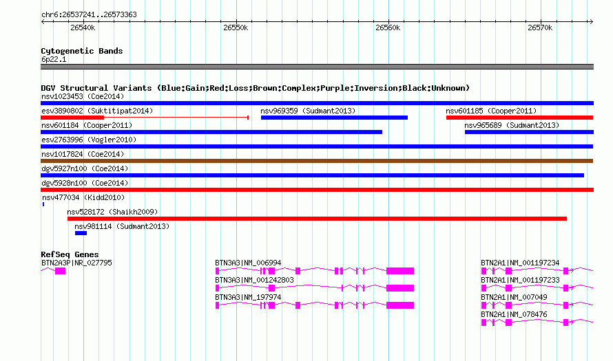 | | Variant Type | CNV loss | | Copy Number | | | Allele State | | | Allele Origin | | | Probe Count | | | Validation Flag | | | Merged Status | M | | Merged Variants | dgv5928n100 | | Supporting Variants | nssv3749051, nssv3749052, nssv3749053 | | Samples | | | Known Genes | BTN2A1, BTN2A3P, BTN3A3 | | Method | SNP array | | Analysis | Affymetrix SNP array copy number analysis | | Platform | Affymetrix SNP Array 6.0 | | Comments | | | Reference | Coe_et_al_2014 | | Pubmed ID | 25217958 | | Accession Number(s) | nsv1024483