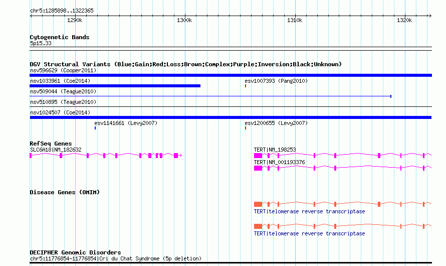 Variant DetailsVariant: nsv1024507| Internal ID | 18767039 | | Landmark | | | Location Information | | | Cytoband | 5p15.33 | | Allele length | | Assembly | Allele length | | hg38 | 36468 | | hg19 | 36468 | | hg18 | 36468 |