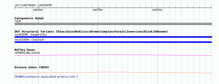 | | Variant Type | CNV gain | | Copy Number | | | Allele State | | | Allele Origin | | | Probe Count | | | Validation Flag | | | Merged Status | M | | Merged Variants | | | Supporting Variants | nssv3674232, nssv3674233, nssv3757720 | | Samples | | | Known Genes | CNTNAP2, MIR548I4 | | Method | SNP array | | Analysis | Affymetrix SNP array copy number analysis | | Platform | Affymetrix SNP Array 6.0 | | Comments | | | Reference | Coe_et_al_2014 | | Pubmed ID | 25217958 | | Accession Number(s) | nsv1024540