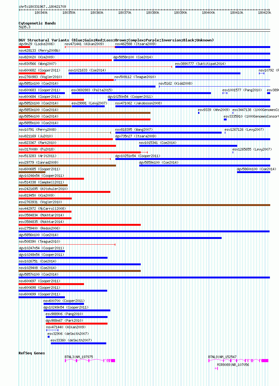 | | Variant Type | CNV gain | | Copy Number | | | Allele State | | | Allele Origin | | | Probe Count | | | Validation Flag | | | Merged Status | M | | Merged Variants | dgv5857n100 | | Supporting Variants | nssv3650331 | | Samples | | | Known Genes | BTNL3, BTNL9, MIR8089 | | Method | SNP array | | Analysis | Affymetrix SNP array copy number analysis | | Platform | Affymetrix SNP Array 6.0 | | Comments | | | Reference | Coe_et_al_2014 | | Pubmed ID | 25217958 | | Accession Number(s) | nsv1024794