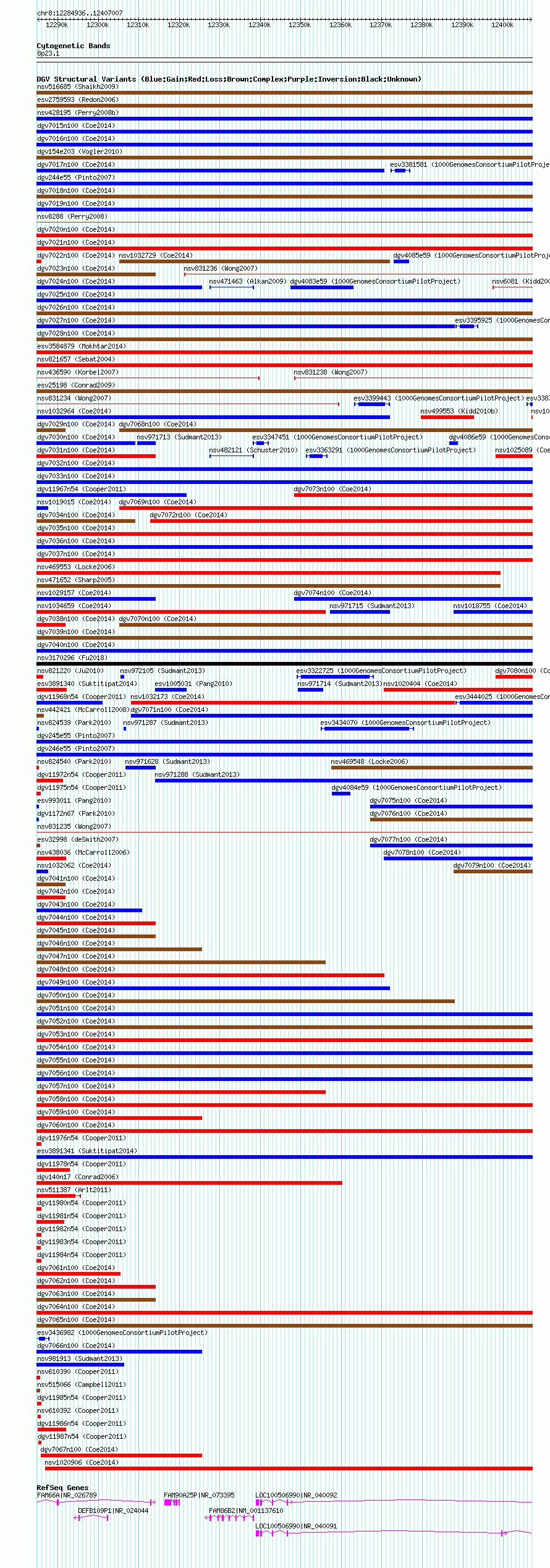 Variant DetailsVariant: nsv1024901| Internal ID | 19114118 | | Landmark | | | Location Information | | | Cytoband | 8p23.1 | | Allele length | | Assembly | Allele length | | hg38 | 122072 | | hg19 | 122072 | | hg18 | 122072 |