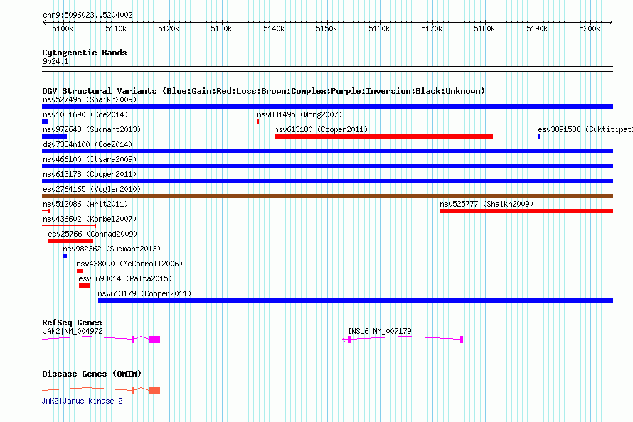 | | Variant Type | CNV gain | | Copy Number | | | Allele State | | | Allele Origin | | | Probe Count | | | Validation Flag | | | Merged Status | M | | Merged Variants | dgv7384n100 | | Supporting Variants | nssv3758098 | | Samples | | | Known Genes | INSL6, JAK2 | | Method | SNP array | | Analysis | Affymetrix SNP array copy number analysis | | Platform | Affymetrix SNP Array 6.0 | | Comments | | | Reference | Coe_et_al_2014 | | Pubmed ID | 25217958 | | Accession Number(s) | nsv1025914
