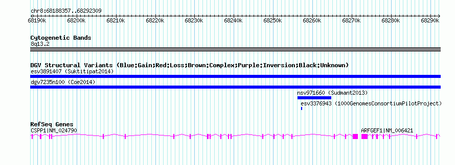 | | Variant Type | CNV gain | | Copy Number | | | Allele State | | | Allele Origin | | | Probe Count | | | Validation Flag | | | Merged Status | M | | Merged Variants | dgv7235n100 | | Supporting Variants | nssv3689485 | | Samples | | | Known Genes | ARFGEF1, CSPP1 | | Method | SNP array | | Analysis | Affymetrix SNP array copy number analysis | | Platform | Affymetrix SNP Array 6.0 | | Comments | | | Reference | Coe_et_al_2014 | | Pubmed ID | 25217958 | | Accession Number(s) | nsv1025996