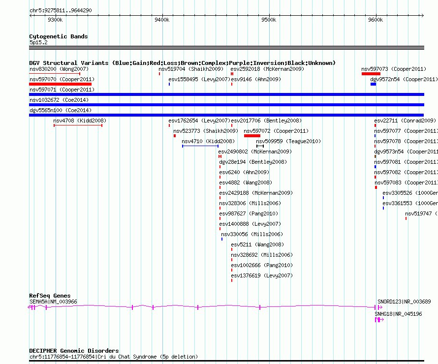 Variant DetailsVariant: nsv1026078| Internal ID | 19115295 | | Landmark | | | Location Information | | | Cytoband | 5p15.2 | | Allele length | | Assembly | Allele length | | hg38 | 368480 | | hg19 | 368480 | | hg18 | 368480 |