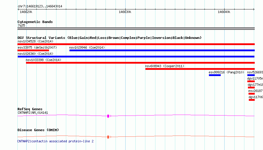 | | Variant Type | CNV gain | | Copy Number | | | Allele State | | | Allele Origin | | | Probe Count | | | Validation Flag | | | Merged Status | M | | Merged Variants | | | Supporting Variants | nssv3674228 | | Samples | | | Known Genes | CNTNAP2, MIR548I4 | | Method | SNP array | | Analysis | Affymetrix SNP array copy number analysis | | Platform | Affymetrix SNP Array 6.0 | | Comments | | | Reference | Coe_et_al_2014 | | Pubmed ID | 25217958 | | Accession Number(s) | nsv1026360