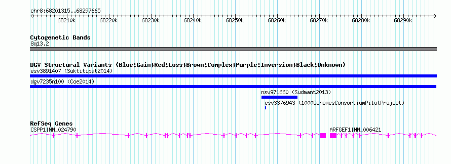 | | Variant Type | CNV gain | | Copy Number | | | Allele State | | | Allele Origin | | | Probe Count | | | Validation Flag | | | Merged Status | M | | Merged Variants | dgv7235n100 | | Supporting Variants | nssv3689487, nssv3689486 | | Samples | | | Known Genes | ARFGEF1, CSPP1 | | Method | SNP array | | Analysis | Affymetrix SNP array copy number analysis | | Platform | Affymetrix SNP Array 6.0 | | Comments | | | Reference | Coe_et_al_2014 | | Pubmed ID | 25217958 | | Accession Number(s) | nsv1026508