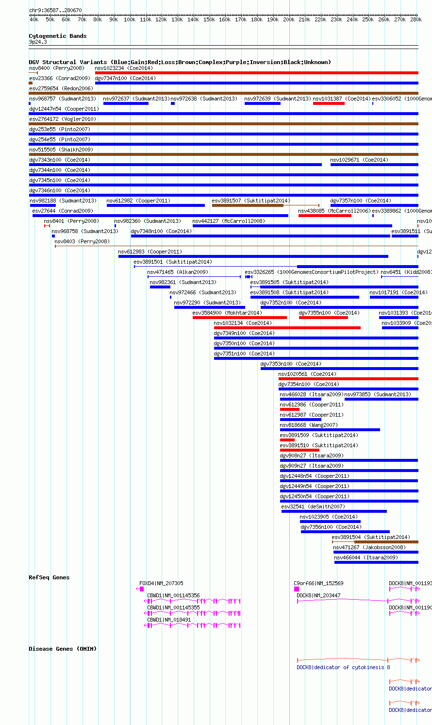 | | Variant Type | CNV gain | | Copy Number | | | Allele State | | | Allele Origin | | | Probe Count | | | Validation Flag | | | Merged Status | M | | Merged Variants | dgv7344n100 | | Supporting Variants | nssv3690946, nssv3690945 | | Samples | | | Known Genes | C9orf66, CBWD1, DOCK8, FOXD4 | | Method | SNP array | | Analysis | Affymetrix SNP array copy number analysis | | Platform | Affymetrix SNP Array 6.0 | | Comments | | | Reference | Coe_et_al_2014 | | Pubmed ID | 25217958 | | Accession Number(s) | nsv1026546