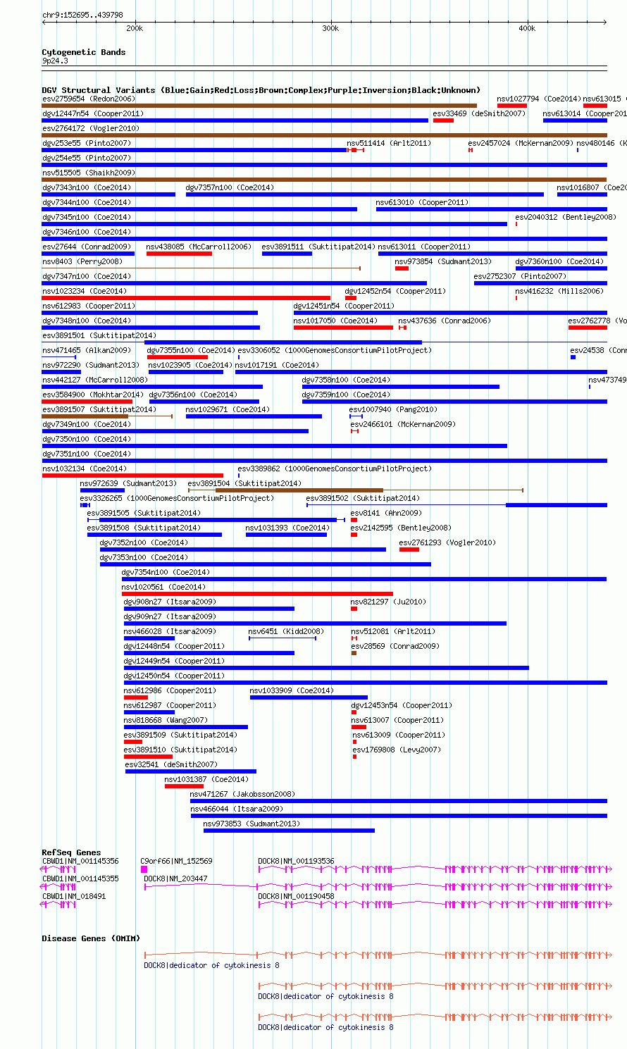 Variant DetailsVariant: nsv1026580| Internal ID | 19115798 | | Landmark | | | Location Information | | | Cytoband | 9p24.3 | | Allele length | | Assembly | Allele length | | hg38 | 287104 | | hg19 | 287104 | | hg18 | 287104 |