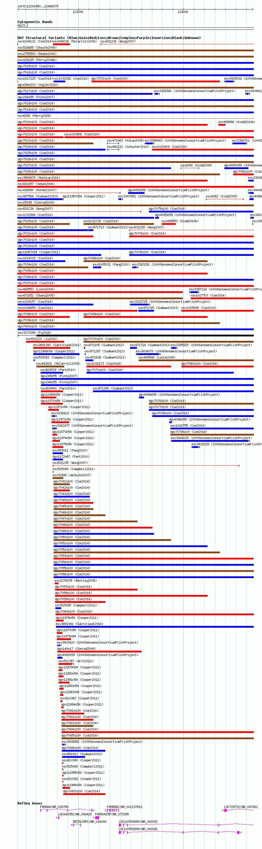 Variant DetailsVariant: nsv1026946| Internal ID | 19116164 | | Landmark | | | Location Information | | | Cytoband | 8p23.1 | | Allele length | | Assembly | Allele length | | hg38 | 223900 | | hg19 | 223900 | | hg18 | 223900 |