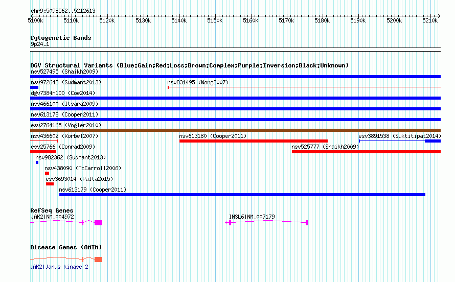 | | Variant Type | CNV gain | | Copy Number | | | Allele State | | | Allele Origin | | | Probe Count | | | Validation Flag | | | Merged Status | M | | Merged Variants | dgv7384n100 | | Supporting Variants | nssv3692412 | | Samples | | | Known Genes | INSL6, JAK2 | | Method | SNP array | | Analysis | Affymetrix SNP array copy number analysis | | Platform | Affymetrix SNP Array 6.0 | | Comments | | | Reference | Coe_et_al_2014 | | Pubmed ID | 25217958 | | Accession Number(s) | nsv1027127