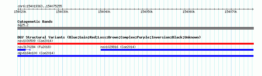 Variant DetailsVariant: nsv1027141| Internal ID | 19116360 | | Landmark | | | Location Information | | | Cytoband | 6q25.2 | | Allele length | | Assembly | Allele length | | hg38 | 55893 | | hg19 | 55893 | | hg18 | 55893 |