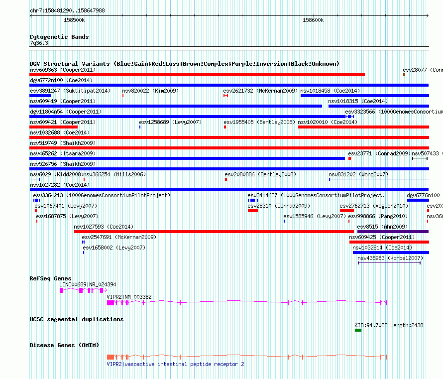 | | Variant Type | CNV gain | | Copy Number | | | Allele State | | | Allele Origin | | | Probe Count | | | Validation Flag | | | Merged Status | M | | Merged Variants | | | Supporting Variants | nssv3674789 | | Samples | | | Known Genes | LINC00689, VIPR2 | | Method | SNP array | | Analysis | Affymetrix SNP array copy number analysis | | Platform | Affymetrix SNP Array 6.0 | | Comments | | | Reference | Coe_et_al_2014 | | Pubmed ID | 25217958 | | Accession Number(s) | nsv1027282