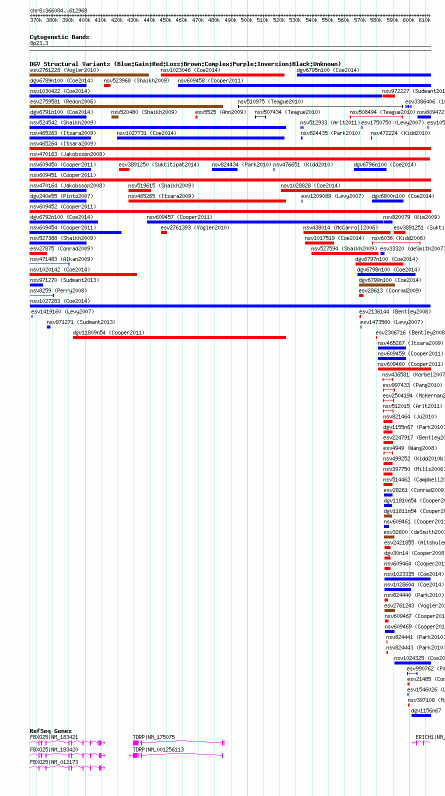 Variant DetailsVariant: nsv1027283| Internal ID | 19116502 | | Landmark | | | Location Information | | | Cytoband | 8p23.3 | | Allele length | | Assembly | Allele length | | hg38 | 246885 | | hg19 | 246885 | | hg18 | 246885 |