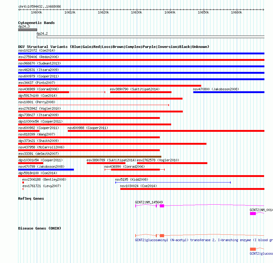 | Variant Type | CNV loss | Copy Number | | Allele State | | Allele Origin | | Probe Count | | Validation Flag | | Merged Status | M | Merged Variants | dgv5918n100 | Supporting Variants | nssv3749028, nssv3749029 | Samples | | Known Genes | GCNT2 | Method | SNP array | Analysis | Affymetrix SNP array copy number analysis | Platform | Affymetrix SNP Array 6.0 | Comments | | Reference | Coe_et_al_2014 | Pubmed ID | 25217958 | Accession Number(s) | nsv1027649