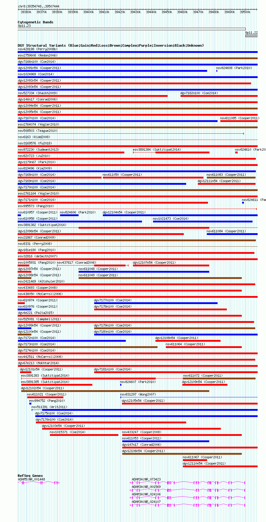 | | Variant Type | CNV gain+loss | | Copy Number | | | Allele State | | | Allele Origin | | | Probe Count | | | Validation Flag | | | Merged Status | M | | Merged Variants | dgv7170n100 | | Supporting Variants | nssv3756625, nssv3686165, nssv3686151, nssv3686124, nssv3686144, nssv3686177, nssv3686131, nssv3686202, nssv3686133, nssv3686181, nssv3686164, nssv3686157, nssv3686103, nssv3686182, nssv3686128, nssv3686186, nssv3686156, nssv3686189, nssv3686188, nssv3686113, nssv3756620, nssv3686152, nssv3686187, nssv3686106, nssv3686178, nssv3686138, nssv3686196, nssv3686137, nssv3686191, nssv3686120, nssv3686192, nssv3686174, nssv3686155, nssv3686132, nssv3686134, nssv3686146, nssv3686125, nssv3686122, nssv3686200, nssv3686148, nssv3686195, nssv3686198, nssv3756626, nssv3756617, nssv3686145, nssv3756621, nssv3686175, nssv3686150, nssv3756624, nssv3686121, nssv3686170, nssv3756622, nssv3686127, nssv3686166, nssv3686130, nssv3686173, nssv3686163, nssv3686129, nssv3686114, nssv3686112, nssv3686162, nssv3686126, nssv3686159, nssv3686179, nssv3686153, nssv3686143, nssv3686140, nssv3686194, nssv3686147, nssv3686110, nssv3686158, nssv3686118, nssv3686105, nssv3756623, nssv3686119, nssv3686149, nssv3686193, nssv3686135, nssv3756615, nssv3756627, nssv3686183, nssv3686116, nssv3756616, nssv3686190, nssv3686160, nssv3686199, nssv3686161, nssv3686117, nssv3686172, nssv3686107, nssv3686169, nssv3756618, nssv3686136, nssv3686109, nssv3686108, nssv3686171, nssv3756628, nssv3686168, nssv3686123, nssv3686104, nssv3686176, nssv3686185, nssv3686141, nssv3686111, nssv3686180, nssv3686154, nssv3686139, nssv3686184, nssv3686167, nssv3686201, nssv3686142, nssv3686115, nssv3756619, nssv3686197 | | Samples | | | Known Genes | ADAM3A, ADAM5 | | Method | SNP array | | Analysis | Affymetrix SNP array copy number analysis | | Platform | Affymetrix SNP Array 6.0 | | Comments | | | Reference | Coe_et_al_2014 | | Pubmed ID | 25217958 | | Accession Number(s) | nsv1027710