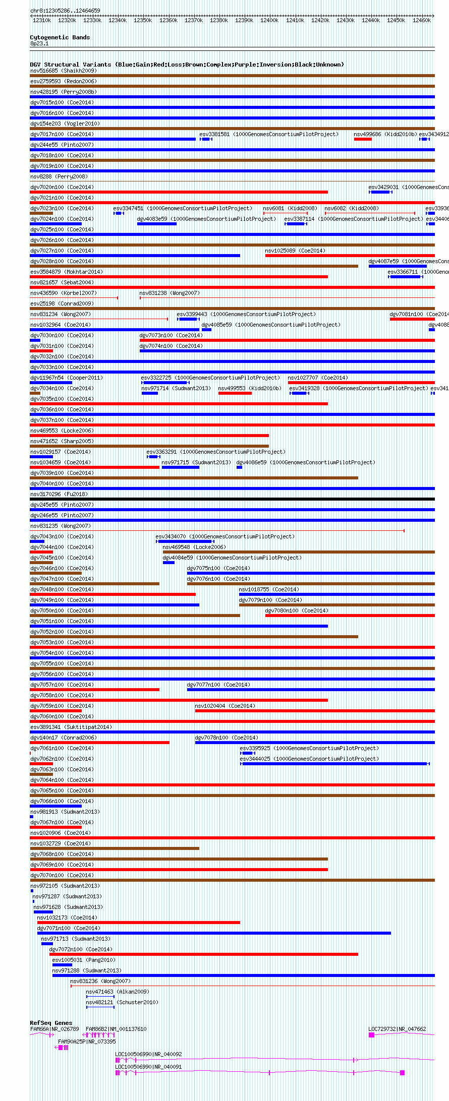 Variant DetailsVariant: nsv1027737| Internal ID | 19116955 | | Landmark | | | Location Information | | | Cytoband | 8p23.1 | | Allele length | | Assembly | Allele length | | hg38 | 159374 | | hg19 | 159374 | | hg18 | 159374 |