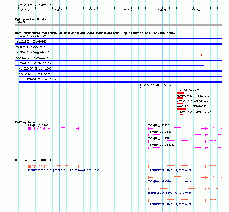 | | Variant Type | CNV gain | | Copy Number | | | Allele State | | | Allele Origin | | | Probe Count | | | Validation Flag | | | Merged Status | M | | Merged Variants | dgv6319n100 | | Supporting Variants | nssv3752947 | | Samples | | | Known Genes | BBS9, RP9 | | Method | SNP array | | Analysis | Affymetrix SNP array copy number analysis | | Platform | Affymetrix SNP Array 6.0 | | Comments | | | Reference | Coe_et_al_2014 | | Pubmed ID | 25217958 | | Accession Number(s) | nsv1027807