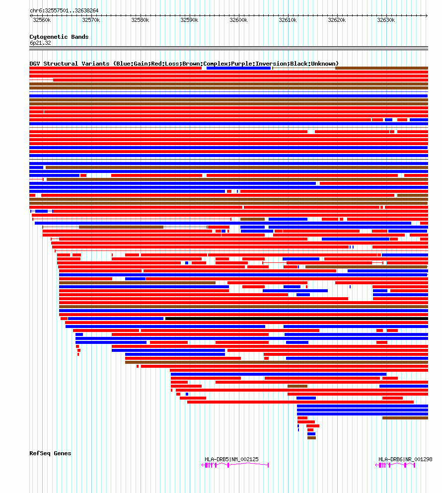 | | Variant Type | CNV gain+loss | | Copy Number | | | Allele State | | | Allele Origin | | | Probe Count | | | Validation Flag | | | Merged Status | M | | Merged Variants | dgv5949n100 | | Supporting Variants | nssv3745423, nssv3745408, nssv3656042, nssv3745407, nssv3745415, nssv3656048, nssv3656049, nssv3745420, nssv3656044, nssv3656035, nssv3745406, nssv3745412, nssv3656039, nssv3745419, nssv3745421, nssv3656046, nssv3745414, nssv3656043, nssv3656040, nssv3656050, nssv3656045, nssv3656041, nssv3656038, nssv3745418, nssv3656036, nssv3745409, nssv3745413, nssv3745422, nssv3656037, nssv3656051, nssv3745416, nssv3745417, nssv3656047, nssv3745410, nssv3745411 | | Samples | | | Known Genes | HLA-DRB5, HLA-DRB6 | | Method | SNP array | | Analysis | Affymetrix SNP array copy number analysis | | Platform | Affymetrix SNP Array 6.0 | | Comments | | | Reference | Coe_et_al_2014 | | Pubmed ID | 25217958 | | Accession Number(s) | nsv1027910