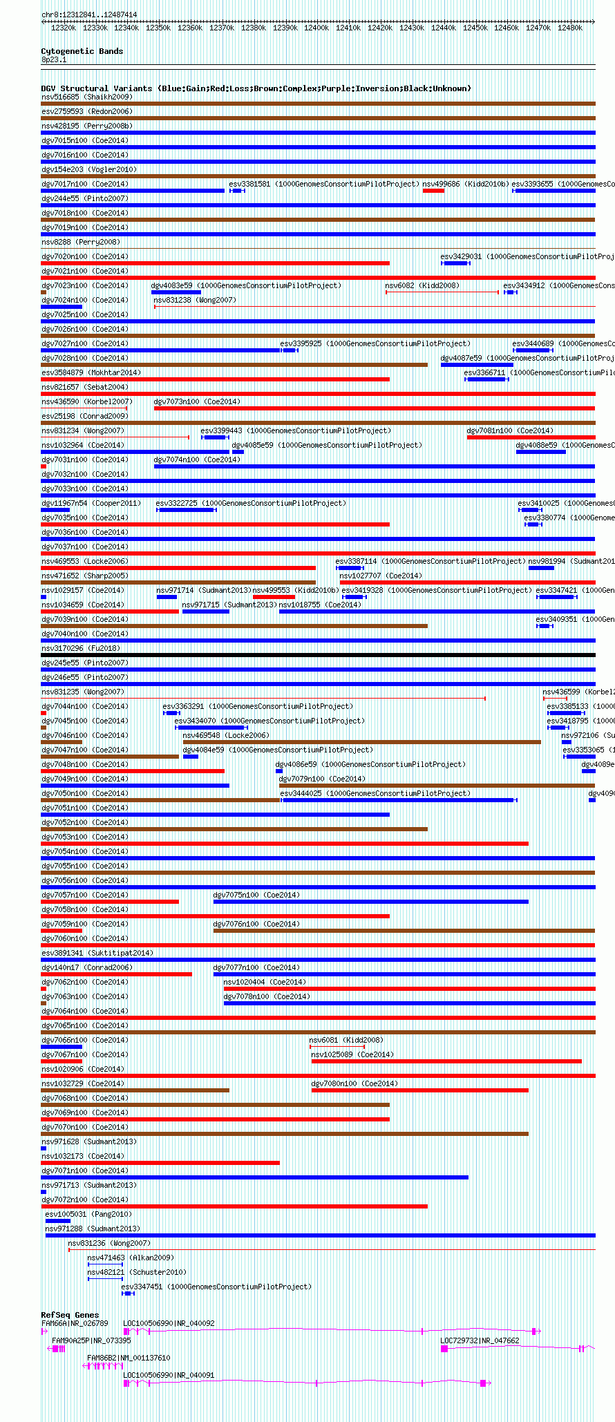 Variant DetailsVariant: nsv1027943| Internal ID | 19117161 | | Landmark | | | Location Information | | | Cytoband | 8p23.1 | | Allele length | | Assembly | Allele length | | hg38 | 174574 | | hg19 | 174574 | | hg18 | 174574 |
