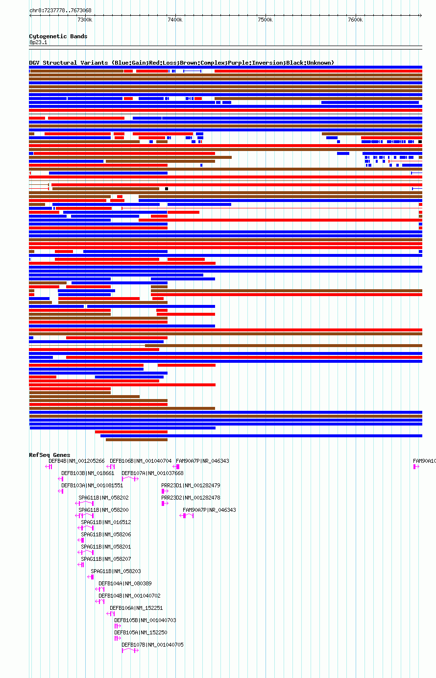 | | Variant Type | CNV gain | | Copy Number | | | Allele State | | | Allele Origin | | | Probe Count | | | Validation Flag | | | Merged Status | M | | Merged Variants | dgv6908n100 | | Supporting Variants | nssv3679017 | | Samples | | | Known Genes | DEFB103A, DEFB103B, DEFB104A, DEFB104B, DEFB105A, DEFB105B, DEFB106A, DEFB106B, DEFB107A, DEFB107B, DEFB4B, FAM90A10P, FAM90A7P, PRR23D1, PRR23D2, SPAG11B | | Method | SNP array | | Analysis | Affymetrix SNP array copy number analysis | | Platform | Affymetrix SNP Array 6.0 | | Comments | | | Reference | Coe_et_al_2014 | | Pubmed ID | 25217958 | | Accession Number(s) | nsv1028270