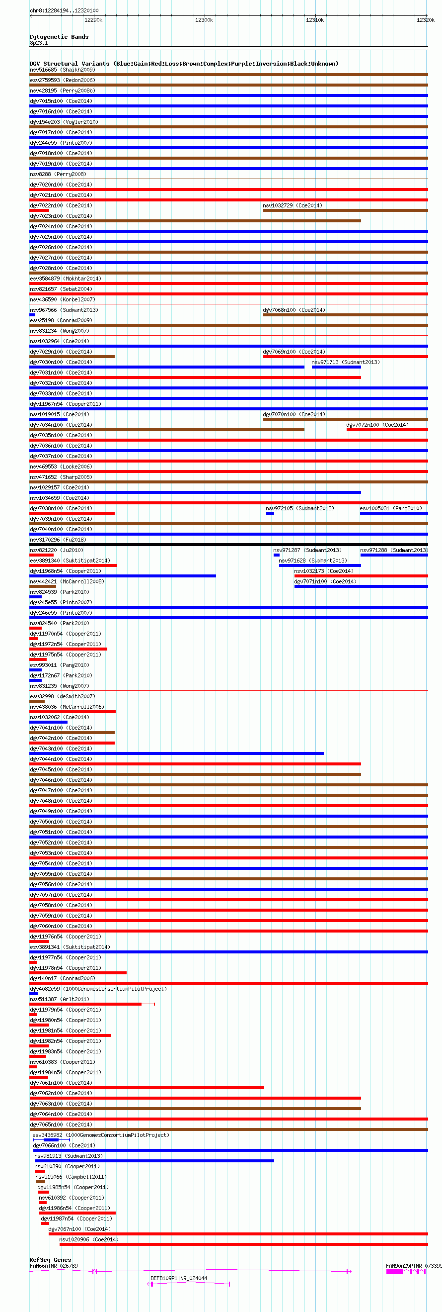 Variant DetailsVariant: nsv1028424| Internal ID | 19117642 | | Landmark | | | Location Information | | | Cytoband | 8p23.1 | | Allele length | | Assembly | Allele length | | hg38 | 35907 | | hg19 | 35907 | | hg18 | 35907 |