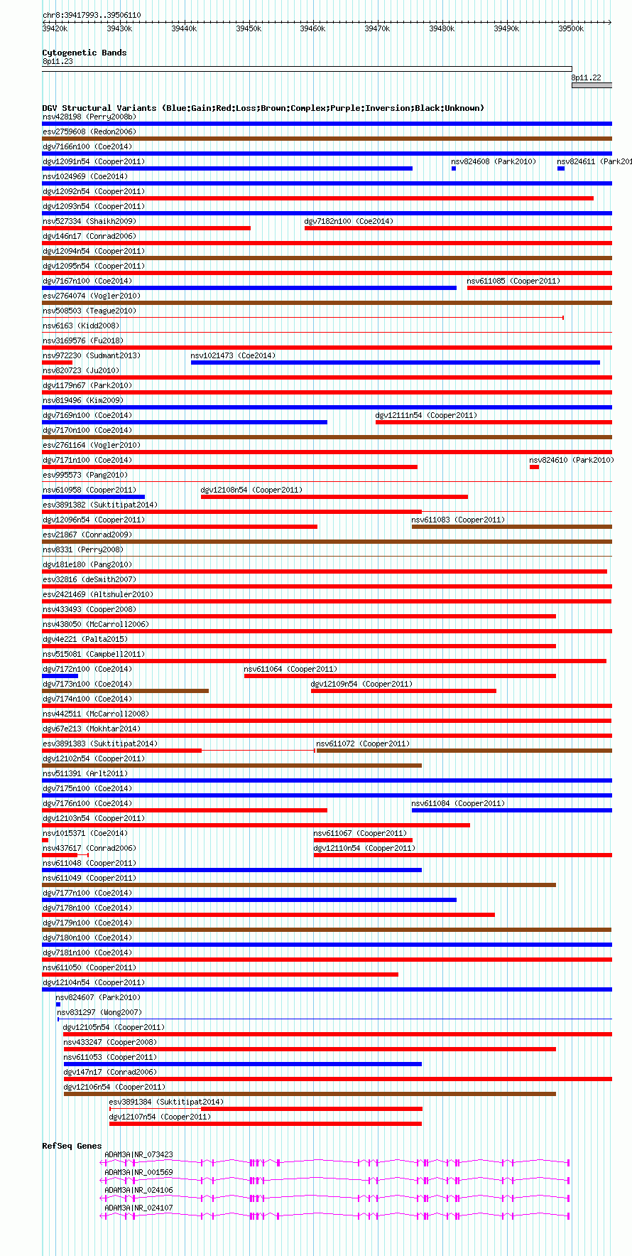 Variant DetailsVariant: nsv1028854 | Internal ID | 19118073 | | Landmark | | | Location Information | | | Cytoband | 8p11.22 | | Allele length | | Assembly | Allele length | | hg38 | 88118 | | hg19 | 88118 | | hg18 | 88118 |