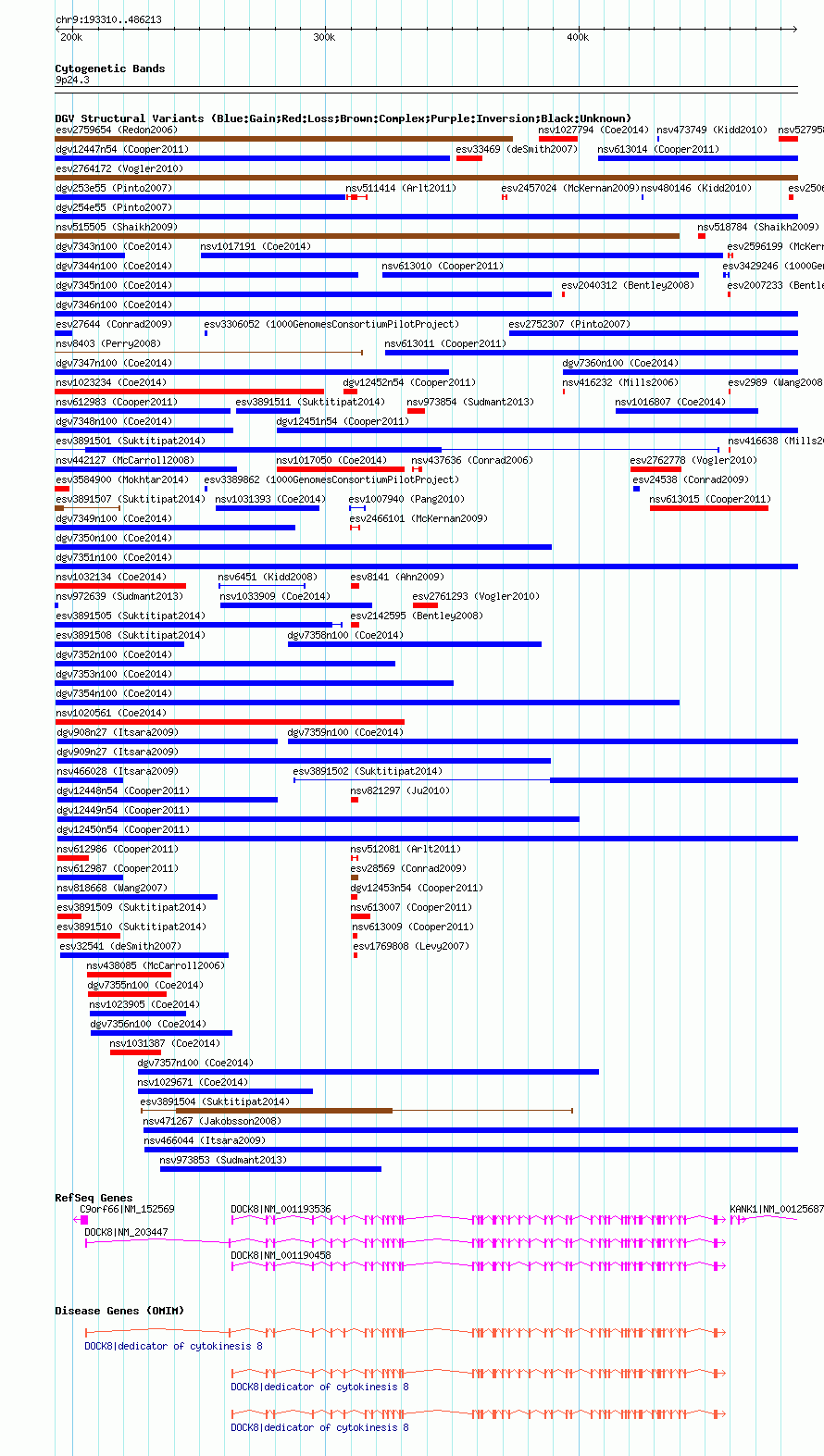 | | Variant Type | CNV gain | | Copy Number | | | Allele State | | | Allele Origin | | | Probe Count | | | Validation Flag | | | Merged Status | M | | Merged Variants | dgv7351n100 | | Supporting Variants | nssv3758065 | | Samples | | | Known Genes | C9orf66, DOCK8, KANK1 | | Method | SNP array | | Analysis | Affymetrix SNP array copy number analysis | | Platform | Affymetrix SNP Array 6.0 | | Comments | | | Reference | Coe_et_al_2014 | | Pubmed ID | 25217958 | | Accession Number(s) | nsv1030075