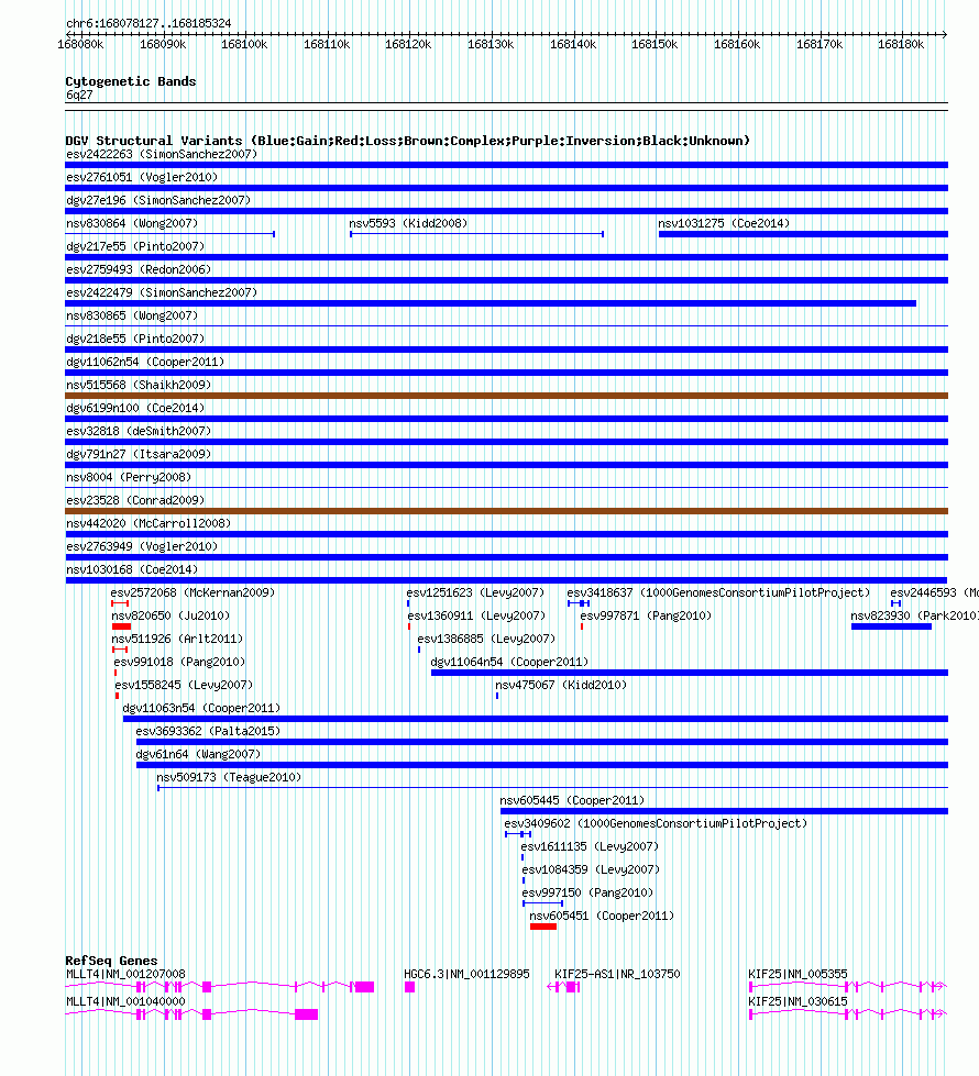 Variant DetailsVariant: nsv1030168| Internal ID | 19119387 | | Landmark | | | Location Information | | | Cytoband | 6q27 | | Allele length | | Assembly | Allele length | | hg38 | 107198 | | hg19 | 107198 | | hg18 | 107198 |