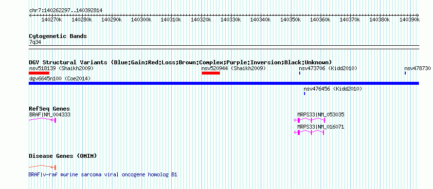 | | Variant Type | CNV gain | | Copy Number | | | Allele State | | | Allele Origin | | | Probe Count | | | Validation Flag | | | Merged Status | M | | Merged Variants | dgv6645n100 | | Supporting Variants | nssv3664286 | | Samples | | | Known Genes | BRAF, MRPS33 | | Method | SNP array | | Analysis | Affymetrix SNP array copy number analysis | | Platform | Affymetrix SNP Array 6.0 | | Comments | | | Reference | Coe_et_al_2014 | | Pubmed ID | 25217958 | | Accession Number(s) | nsv1030195