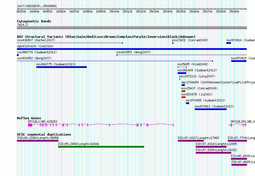 | Variant Type | CNV gain | Copy Number | | Allele State | | Allele Origin | | Probe Count | | Validation Flag | | Merged Status | M | Merged Variants | dgv6320n100 | Supporting Variants | nssv3643405 | Samples | | Known Genes | DPY19L1, DPY19L2P1 | Method | SNP array | Analysis | Affymetrix SNP array copy number analysis | Platform | Affymetrix SNP Array 6.0 | Comments | | Reference | Coe_et_al_2014 | Pubmed ID | 25217958 | Accession Number(s) | nsv1030352
